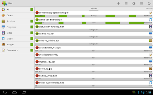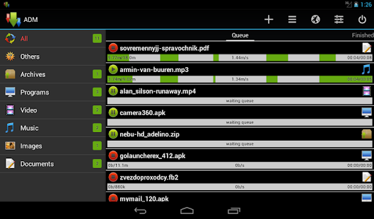 Características: - Descarga de tres archivos simultaneamente. - Descargas aceleradas mediante multiples hilos (9 partes simultaneamente) - Detección de ligas de descarga desde el navegador y en el portapapeles. - Icono de notificación con progreso de descarga en el panel. - Widget de escritorio que muestra la lista de todas las descargas ejecutándose. - Múltiples carpetas de destino dependiendo del tipo de archivo. - Notificación con vibración y sonido cuando se haya terminado alguna descarga. - Reanudación de descargas en caso de desconexión o si se reinicia el programa. - Copias de seguridad de la lista de descargas y ajustes del programa a la tarjeta SD. - Navegador integrado para sitios que requieran identificarse antes de descargar. - Planificador de descargas. - Administrador de sitios, y más...