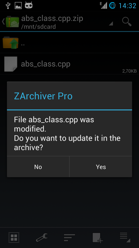 Modificación del archivo en el archivo es la capacidad de actualizar el archivo en el archivo después de cambiar en un programa externo. Para hacer esto: abrir el archivo desde el archivo, seleccione la aplicación (si es necesario), edite el archivo, guardar los cambios, volver a ZArchiver. Se le pedirá que actualice el archivo en el archivo, cuando regrese a ZArchiver. Si por alguna razón no se le pregunte si desea actualizar el archivo, el archivo modificado se puede encontrar en la tarjeta de memoria en tu Android / ru.zdevs.zarchiver.pro / temp /.