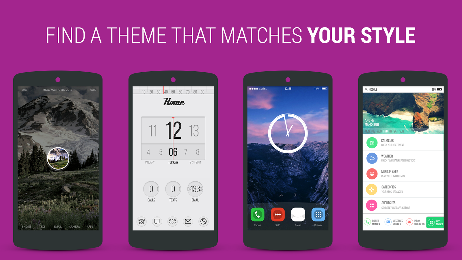 Themer lanzador tiene temas con fondos de escritorio de alta definición, paquetes de iconos, y los widgets preconfigurados para cualquier estado de ánimo o la ocasión. Flip a través de nuestra amplia biblioteca de temas, premium gratis. El teléfono al instante se vea mejor y sentirse completamente nuevo. Simplemente pulse en "Aplicar" y todo está listo para usted.