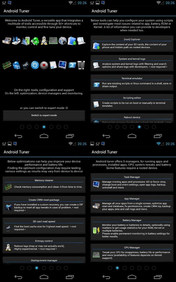 - Control del sistema (por ejemplo control de la temperatura y editar el archivo Build.prop)