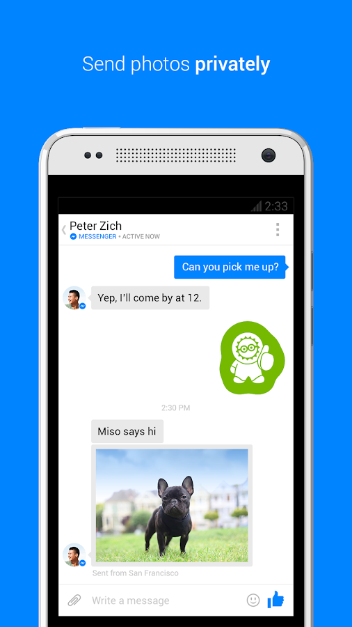 Messenger es un modo sencillo y confiable de mantenerte en contacto. Es como enviar mensajes de texto, pero no tienes que pagar por cada mensaje (funciona con tu plan de datos).