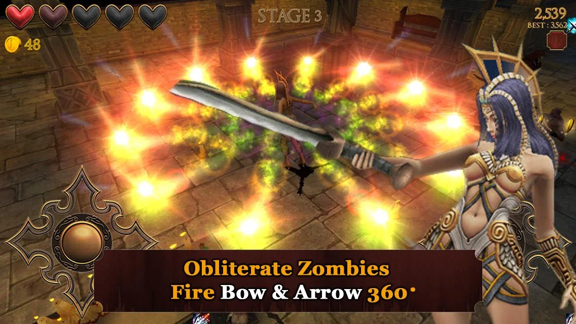 • Utilice un arco para disparar a los zombis como en la tercera shooter-personal